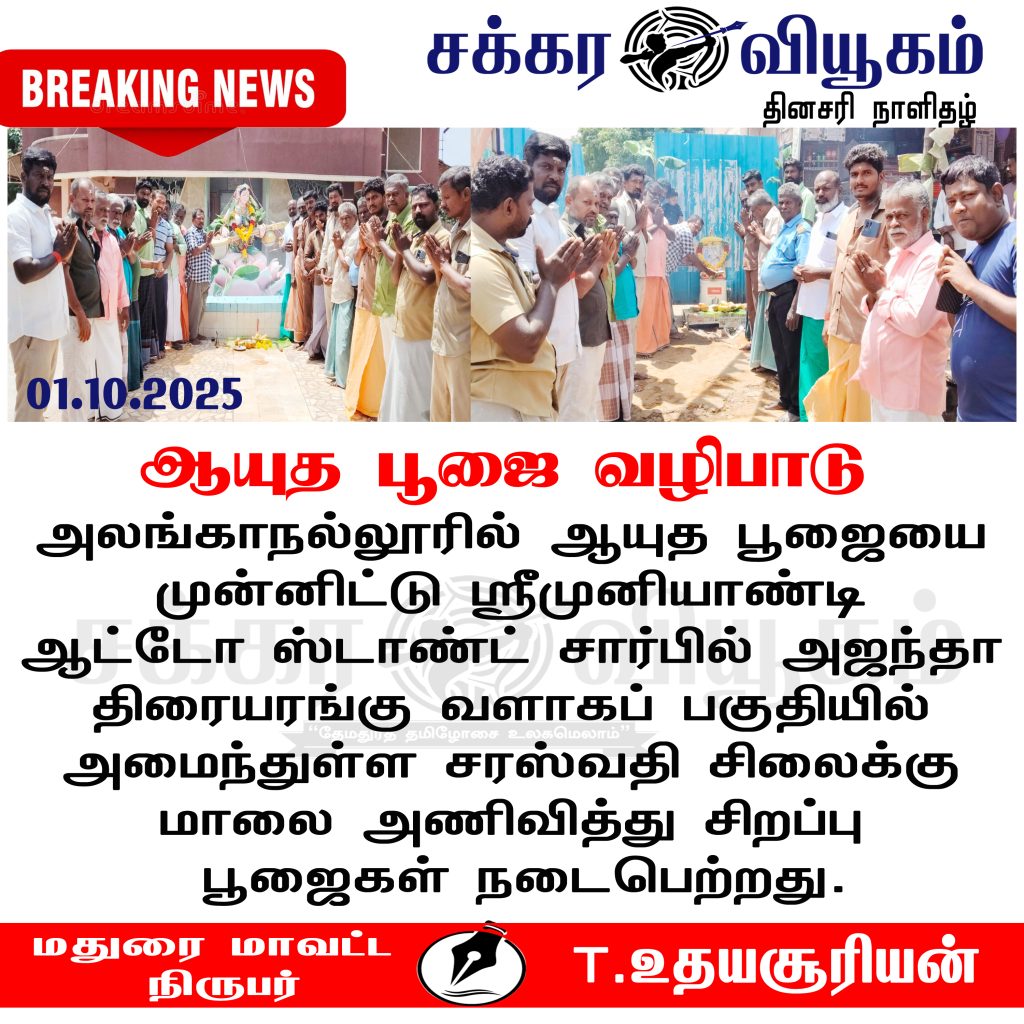 மதுரை மாவட்டம் அலங்காநல்லூர் பேருந்து நிலையப் பகுதியில் அமைந்துள்ள ஸ்ரீ முனியாண்டி ஆட்டோ நிலையம் நேற்று ஆயுத பூஜையை முன்னிட்டு, ஆட்டோ ஸ்டாண்ட் சார்பில் அதன் நிர்வாகிகள் கலந்து கொண்டு, அஜந்தா திரையரங்கு வளாகப் பகுதியில் அமைந்துள்ள சரஸ்வதி சிலைக்கு மாலை அணிவித்து பொறி கடலை, சுண்டல், கொழுக்கட்டை, ஆப்பிள், கொய்யாப்பழம், வாழைப்பழம், வெற்றிலை, பாக்கு, உள்ளிட்டவைகள் படையல் செய்து வழிபட்டனர். அதற்கு முன்னதாக பிரசித்தி பெற்ற ஸ்ரீ முனியாண்டி கோவிலில் சங்கத்தின் சார்பில் மாலை அணிவித்து பல்வேறு பூஜைகள் நடைபெற்றது. பின்னர் 40க்கும் மேற்பட்ட ஆட்டோக்களுக்கு மாலை அணிவித்து அலங்காரம் செய்து அலங்காநல்லூர் பேருந்து நிலையத்திலிருந்து கேட்டுகடை வரை ஒன்றன்பின் ஒன்றாக வீதி உலா சென்றது.