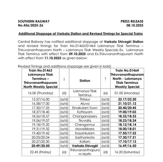 பண்டிகைக் காலத்தில் பயணிகளுக்கு சுமூகமான மற்றும் வசதியான பயணத்தை உறுதி செய்வதற்காக, தெற்கு ரயில்வே கேரளாவிற்கு 21 சிறப்பு ரயில்களை இயக்குவதாக அறிவித்துள்ளது.