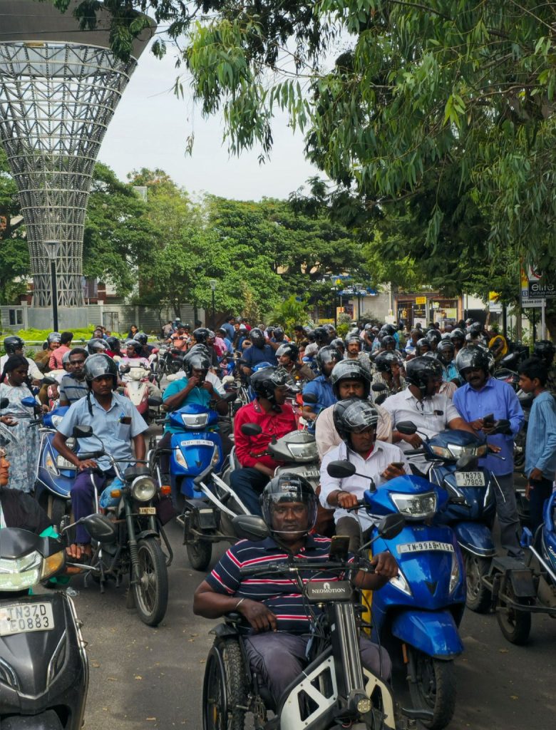 • கோயம்புத்தூர் நகர காவல்துறையின் முழு ஆதரவுடன் நடத்தப்பட்ட இந்த முயற்சி, பொதுமக்களிடையே ஹெல்மெட் பாதுகாப்பு மற்றும் சாலை ஒழுக்கத்தை மேம்படுத்துவதை நோக்கமாகக் கொண்டது. இந்த நிகழ்ச்சியில் 140க்கும் மேற்பட்ட பங்கேற்பாளர்கள் பங்கேற்றனர், இதில் 100 மாற்றுத்திறனாளிகள் ஹெல்மெட் வழங்கப்பட்டு, பாதுகாப்பான மற்றும் பொறுப்பான சவாரி பற்றிய செய்தியை பரப்பும் வகையில் 4 கி.மீ விழிப்புணர்வு பேரணியை நிறைவு செய்தனர்.